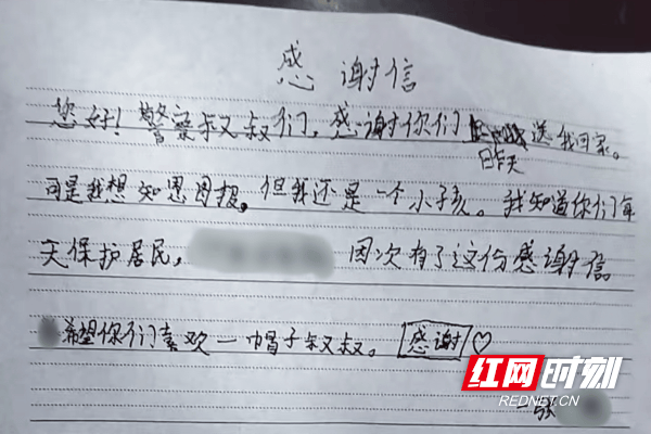 11月17日,在父母的陪同下,小男孩来到东湖寺派出所,将一封亲手写的感谢信送到民辅警手中。这份稚嫩而真诚的感谢,让民辅警的心里暖暖的。
