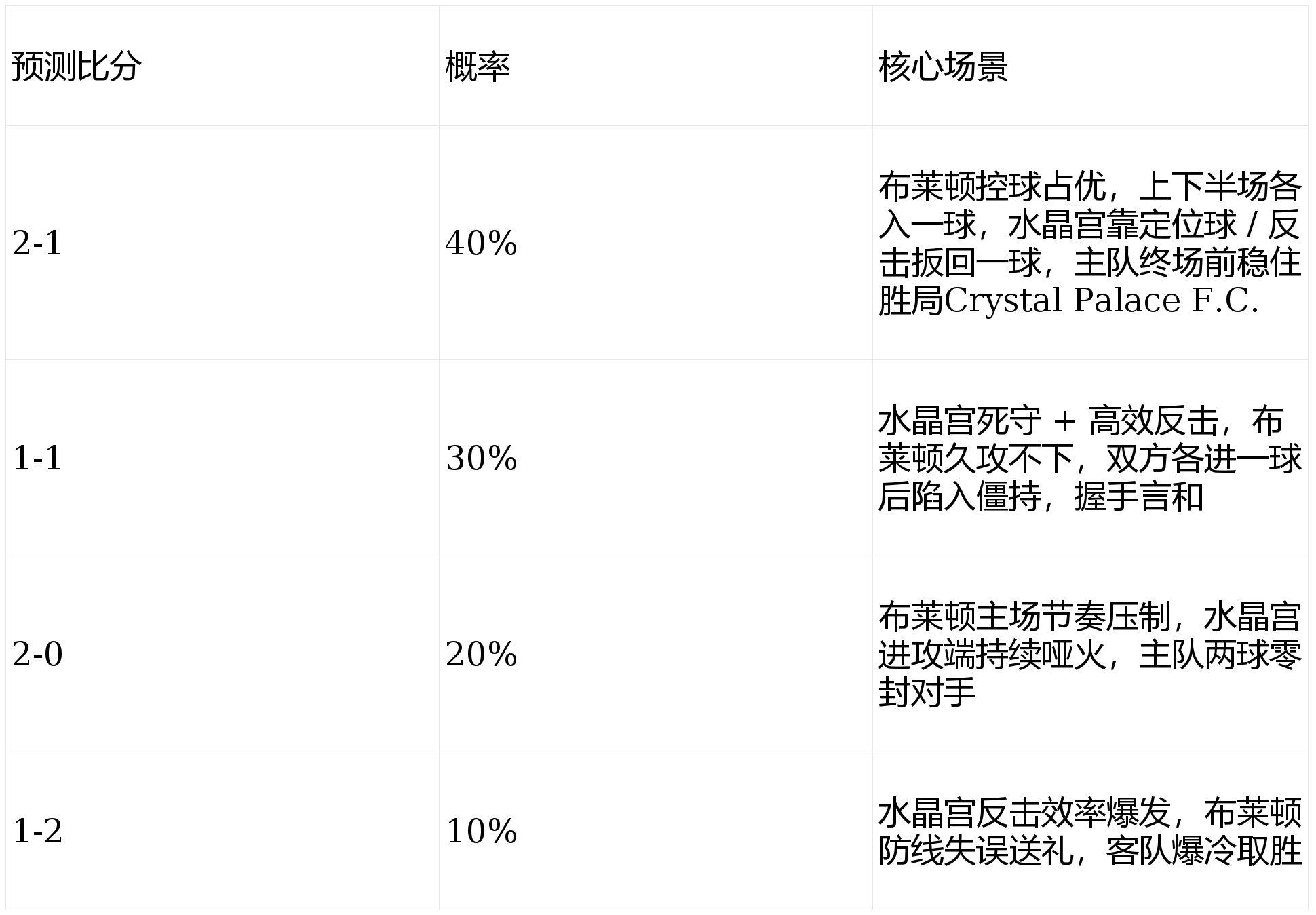 :布莱顿中场深度更足,能持续施压;水晶宫若收缩防线,可能拖入平局,但主队把握机会能力略占优,更易以小比分取胜。